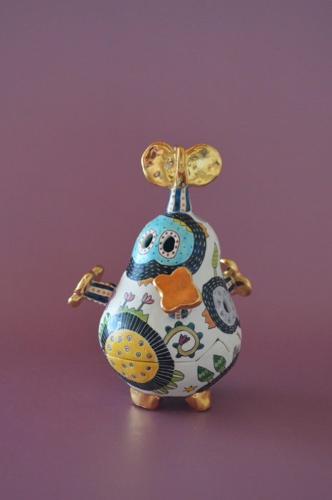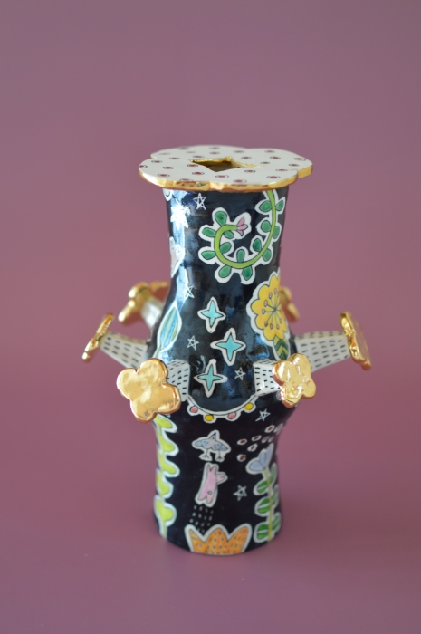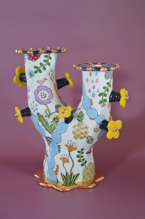 陶を中心に、絵画や器など多彩な造形を展開。植物や動物、旅先の風景をモチーフにし、カラフルで有機的なフォルムを特徴とする。金彩やユニークな絵付けによる軽やかで遊び心のある作品は、鑑賞性と実用性を兼ね備え、暮らしに彩りを添える。近年は関西を中心に個展・グループ展を多数開催。
