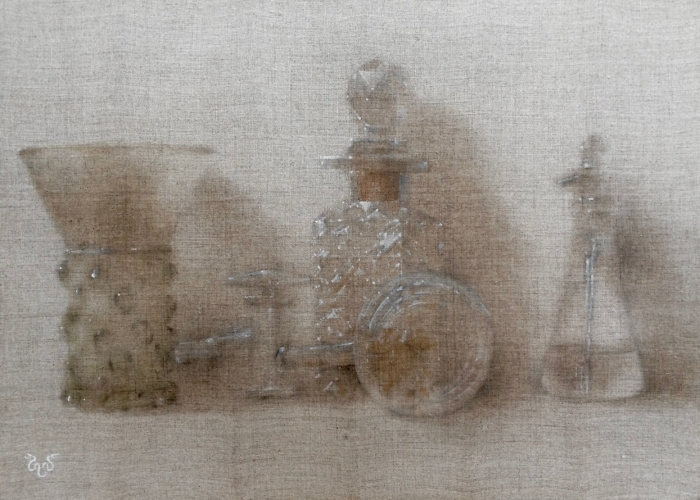 赤木 範陸「アレンビックとガラス器の静物」F4号 麻布、エンカウスティーク
