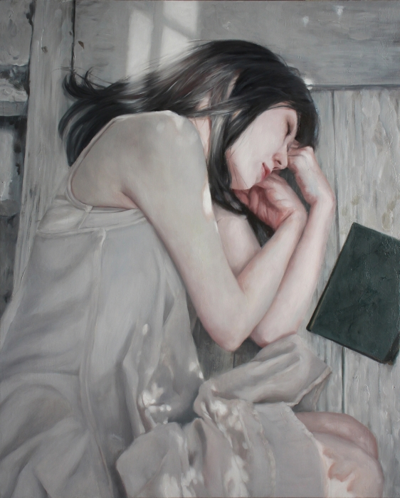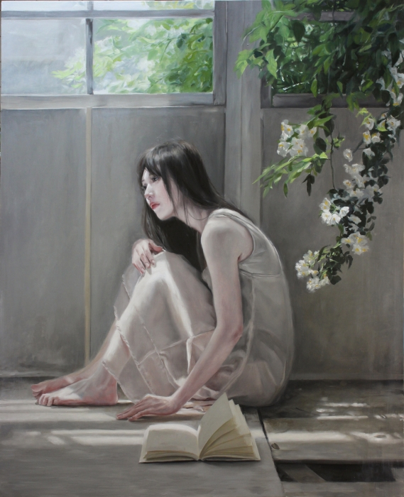 鈴木那奈は、静かな光の中に女性を描くことで、人物の内面を投影する。室内に横たわる姿や海辺に佇む情景など、どの画面にも一人思索に沈む女性像が描かれる。