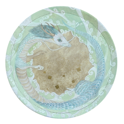 浅埜 水貴「水音」35×56.8×2.5㎝ 岩絵具、水干絵具、金箔、墨、大﨑膠、団扇太鼓、漆(柄部分)