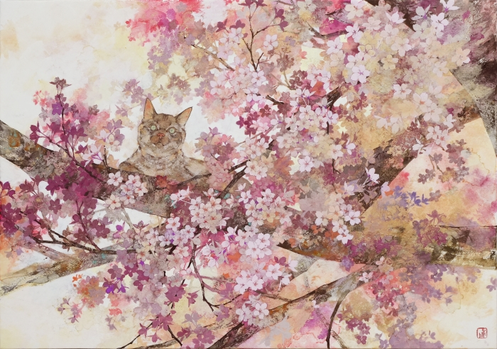 鹿間 麻衣「花見猫」M15号 紙本彩色